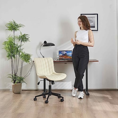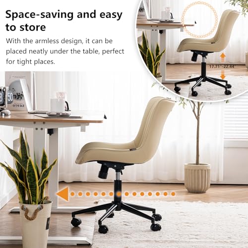 YOUNIKE - كرسي مكتب منزلي من يونيكي دوار بدون ذراعين قابل للتعديل جلد البولي يوريثين مع عجلات كمبيوتر عصري صغير للاظافر خياطة بيج