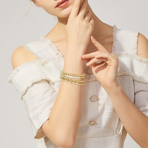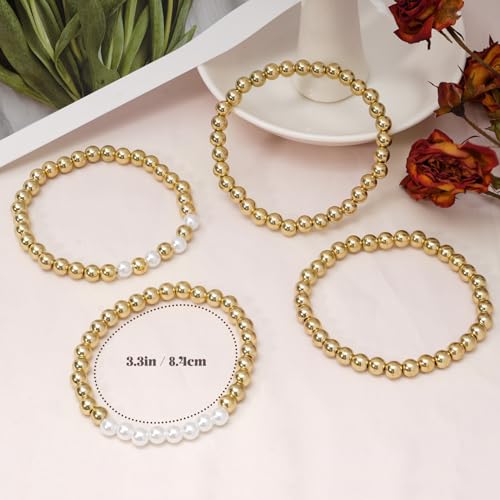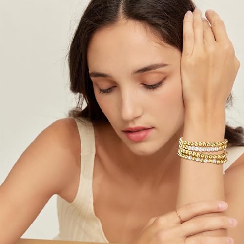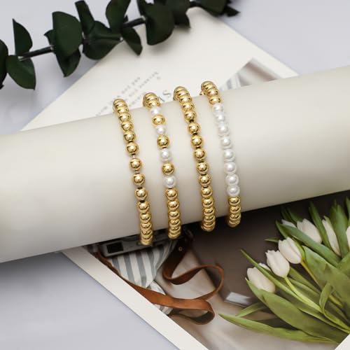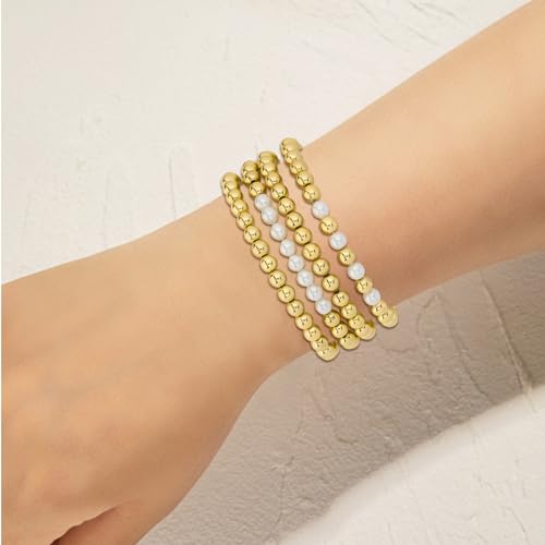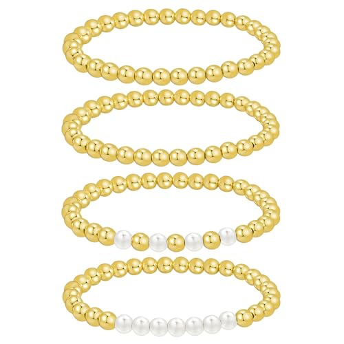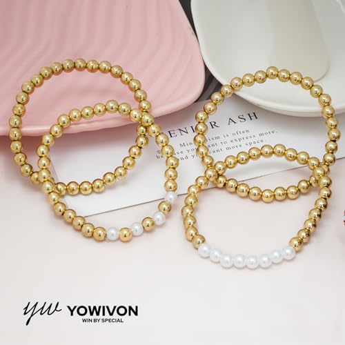Yowivon - اساور خرز ذهبية للنساء من يويفون لؤلؤ مطلية بالذهب عيار 14 قيراط قابلة للتكديس سوار مرن لا يفقد بريقه مجوهرات 4 قطع ذهبي