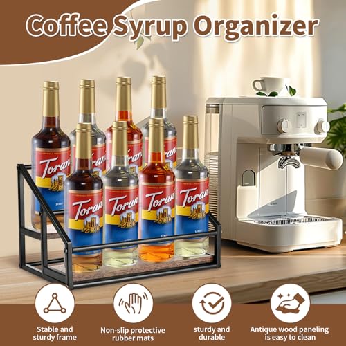 YQBRAO - منظم شراب القهوة من واي كيو براو، رف شراب القهوة من طبقتين و8 زجاجات لبار القهوة، حامل شراب القهوة لمحطة القهوة، حامل شراب القهوة للشراب والتتبيلة