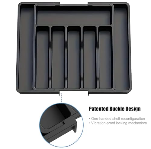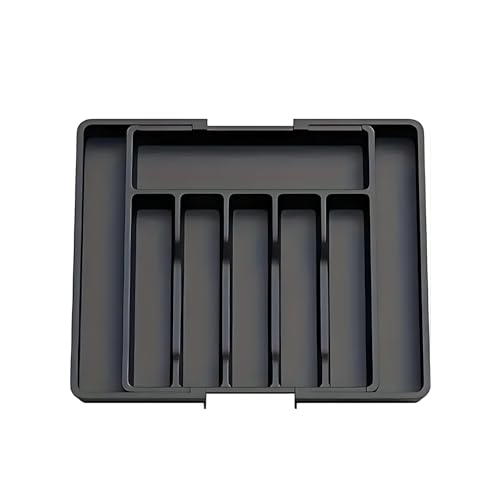 YRXEFY - منظم ادراج فضية كبير قابل للتوسيع من واي ار اكس اي في، صينية ادوات مائدة قابلة للتعديل للمطبخ، تخزين بلاستيك خالي من BPA، حامل ادوات تناول الطعام للملاعق والشوك والسكاكين، ديكور مطبخ اسود