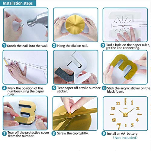 - 【المادة】- ساعات الحائط مصنوعة من مادة فوم ايفا عالية الكثافة ومرايا اكريليك، ومينا ساعة من خليط معدني، ومؤشرات من الألومنيوم. مقاوم للماء، صديق للبيئة، ليس من السهل تشويهه، سهل التركيب ويضفي تأثيرًا عاكسًا على الحائط.