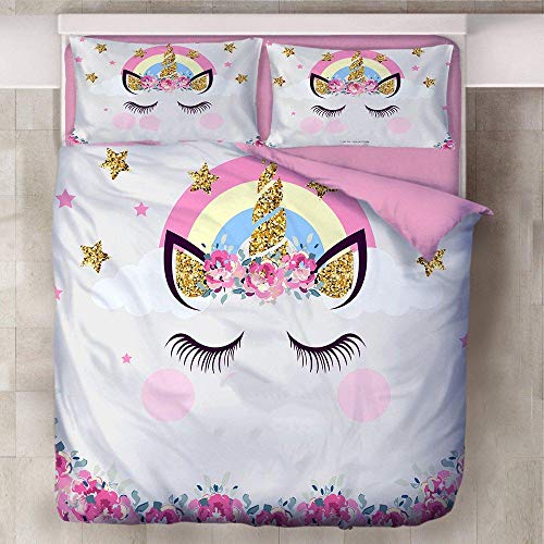 YTBDWOSQ - طقم سرير فردي مكون من غطاء لحاف و2 كيس مخدة بطباعة ثلاثية الابعاد كرتون يونيكورن YTBDWOSQ® مفرش المايكروفايبر الناعم مع سوستة للغلاق للكبار والمراهقين + 2 مقاس 135 × 200 سم، الألياف الدقيقة