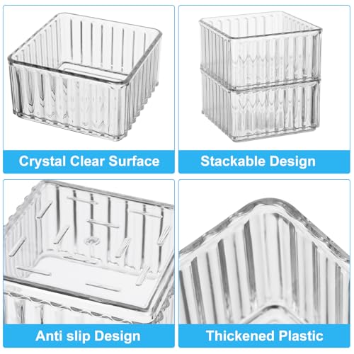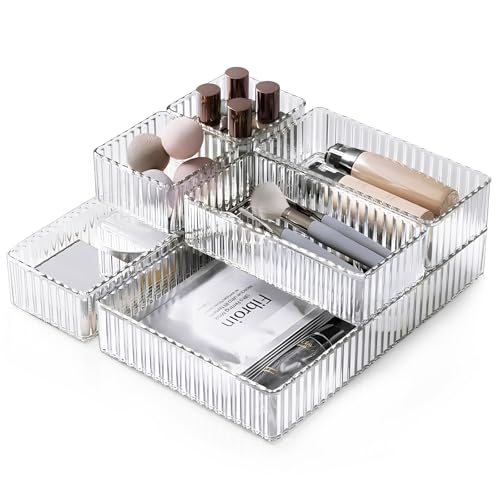 YTOPRO - صناديق تنظيم أدراج شفافة من يوبيرو من 7 قطع، صواني تنظيم أدراج المكياج قابلة للتكديس بـ 4 أحجام، علب تخزين للأدراج، صواني تنظيم أدراج المكتب، فواصل أدراج للمطبخ والحمام والمكياج والمكتب