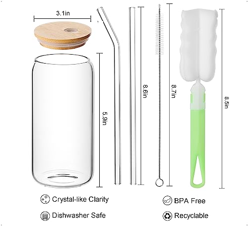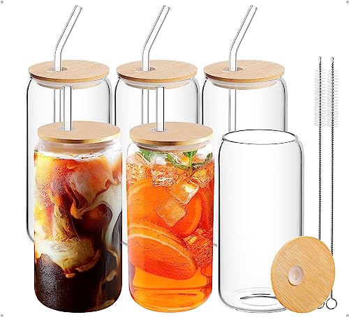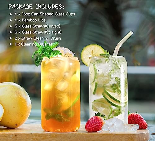 YTVG - طقم اكواب زجاجية مع اغطية من الخيزران وماصات - شرب على شكل علبة سعة 16 اونصة كوب قهوة مثلجة لطيف للسموذي والشاي المثلج والويسكي والبيرة 6 قطع شفاف خيزران زجاجي