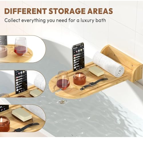 - 【مساحات تخزين متعددة الوظائف】يبلغ مقاس الصينية 40 × 10.9 انش (الطول × العرض)، مع مساحات تخزين متعددة، بما في ذلك فتحة مدمجة للهاتف أو التابلت وفتحة زجاج النبيذ لتخزين جميع مستلزمات الحمام الخاصة بك مثل الجوال والتابلت وكأس النبيذ والصابون والمناشف والمناديل والشموع والشوكولاتة وزيت الاستحمام وأكثر من ذلك. حافظ على كل شيء بدون استخدام اليدين وفي متناول اليد، وخلق تجربة استحمام مثالية لتدليل نفسك والاستمتاع بالوقت الذي تستحقه