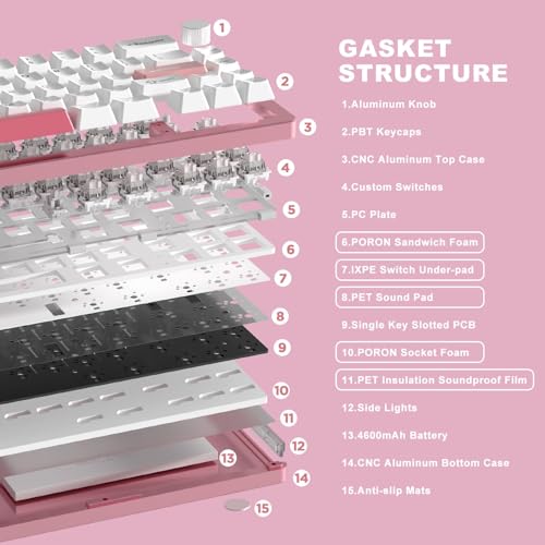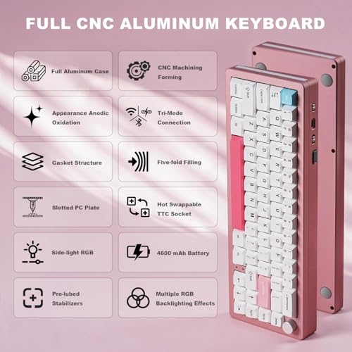YUNZII - لوحة مفاتيح ميكانيكية لاسلكية AL66، تحكم دوار65%، لوحة مفاتيح للألعاب بهيكل ألمنيوم ببلوتوث/2.4G/سلكية، مفاتيح تبديل سريع، إضاءة ملونة ار جي بي مثبتة بإحكام، ويندوز وماك (مفاتيح ميلك، وردي) من يونزيل