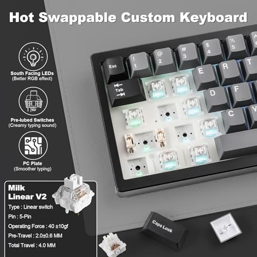YUNZII - لوحة مفاتيح ميكانيكية لاسلكية بنسبة AL68 60% من الألومنيوم تدعم QMK/VIA، مخصص قابلة للتبديل السريع مع مقبض، للألعاب بإضاءة ار جي بي خلفية (أسود، كيبورد ميلك اصدار 2)