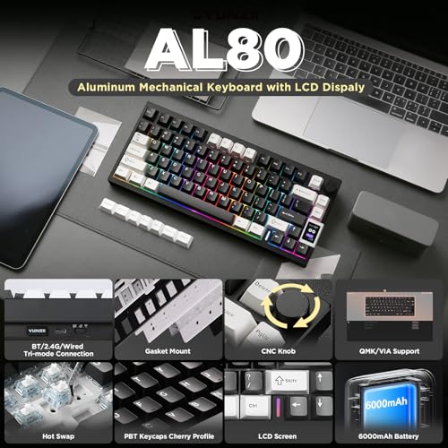 - لوحة مفاتيح LCD مخصصة وفضاء لوني RGB نابض بالحياة - تأتي لوحة المفاتيح الميكانيكية اللاسلكية يونزيل AL80 مع شاشة LCD قابلة للتخصيص يمكنها عرض الوقت وصور GIF والصور وحالة البطارية ووضع الاتصال والمزيد. تحتوي لوحة مفاتيح الألعاب RGB على أكثر من 20 وضع للإضاءة الخلفية و1.68 مليون لون RGB ومصابيح LED مواجهة للجنوب. تدعم مفاتيح الاختصار أو برامج التشغيل ضبط تأثيرات RGB الديناميكية المختلفة، مما يسمح لك بتجربة متعة لا نهاية لها من الفضاء اللوني ار جي بي.