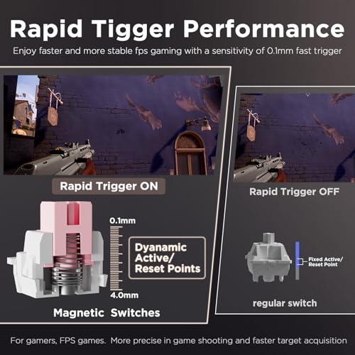 - نقاط تشغيل قابلة للتخصيص: تختلف المفاتيح المغناطيسية بتأثير هول عن المفاتيح التقليدية من حيث أنها تقوم بتنشيط المفاتيح من خلال مسافة التنقل بالمفاتيح. تستخدم لوحة مفاتيح RT68 تقنية دي كيه اس (ضغطة المفاتيح الديناميكية) للقضاء على تقليد وحدات الماكرو التقليدية، ويمكنها ضبط انتقال مفتاح الزناد بين 0.1-4.0 ملم وفقًا للحد الأدنى للوحدة 0.1 ملم. سواء كانت خفيفة أو حركات فائقة السرعة أو ضغطات أعمق، يمكن أن توفر المفاتيح المغناطيسية تحكمًا دقيقًا وفقًا لاحتياجات الاستخدام المختلفة.