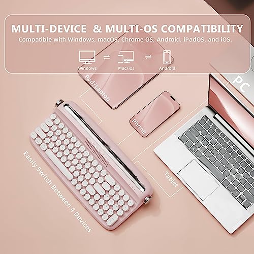 YUNZII - لوحة مفاتيح لاسلكية مطورة من يونزيل بتصميم كلاسيكي على شكل آلة كاتبة مع حامل مدمج USB-C - بلوتوث بغطاء دائري تدعم أنظمة ويندوز وماك لتتوافق أجهزة متعددة B309 وردي فاتح
