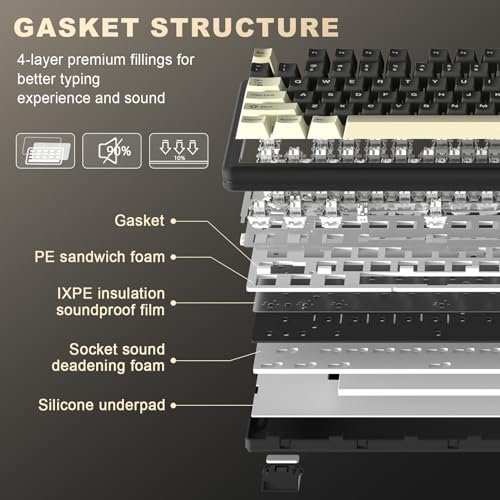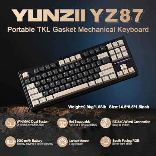 YUNZII - لوحة ألعاب ميكانيكية YZ87 بهيكل عازل لاسلكية بدون لوحة أرقام، تبديل مفاتيح ب 4 طبقات، ببلوتوث 5.0 تردد 2.4G وكابل USB-C وإضاءة RGB وتقنية ان-كاي رول اوفر، لويندوز وماك من يونزيل، أسود وميلك سويتش