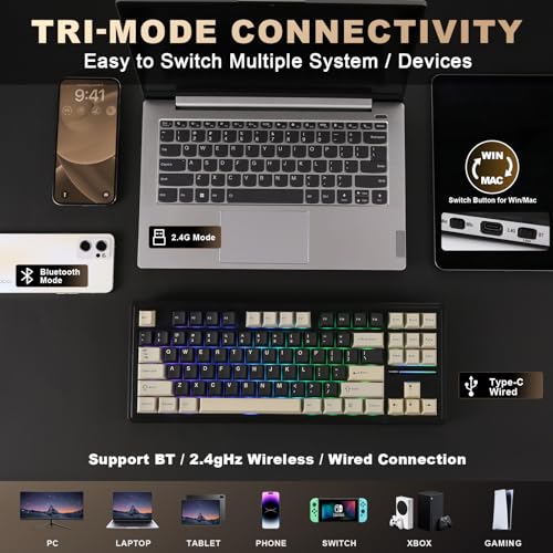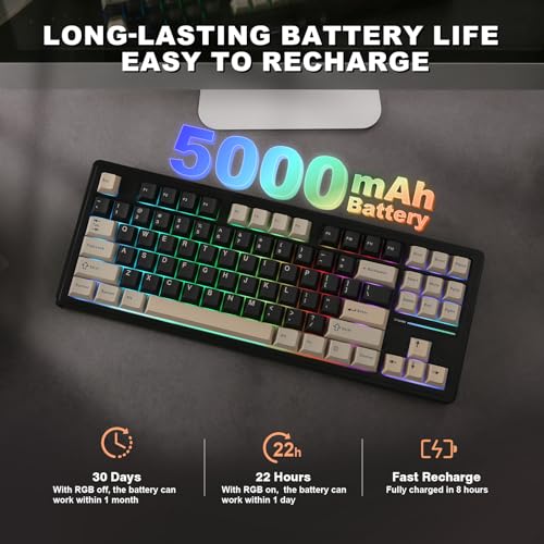 - توفر لوحة المفاتيح اتصالًا لاسلكيًا سلسًا لعدة أجهزة، وبفضل بطاريتها المدمجة بسعة كبيرة تبلغ 5000 مللي أمبير في الساعة، فإنها قابلة لإعادة الشحن كما تتميز بالتحمل العالي أثناء جلسات العمل المتواصلة أو اللعب المكثف. تدعم لوحة المفاتيح الاتصال بالبلوتوث والتردد اللاسلكي 2.4 جيجاهرتز ومنفذ الشحن نوع سي، يمكن للوحة المفاتيح اللاسلكية التوافق مع أجهزة متعددة مثل أجهزة اللاب توب والتابلت والكمبيوتر والموبايل وغيرها، كما تدعم أنظمة التشغيل المختلفة مثل، IOS وويندوز وماك وأندرويد. تضمن لوحة المفاتيح YZ87 اتصالًا سلسًا وثابتًا لثلاثة أجهزة في وقت واحد.