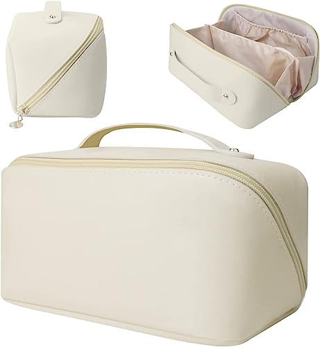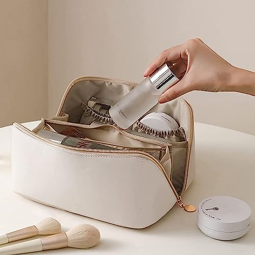 Yuroochii - شنطة مستحضرات تجميل للسفر بسعة كبيرة مكياج مسطحة مقاومة للماء من جلد البولي يوريثين لكل شيء لون ابيض التجميل يوروتشي
