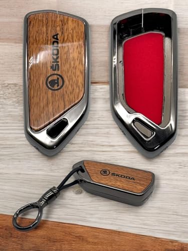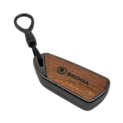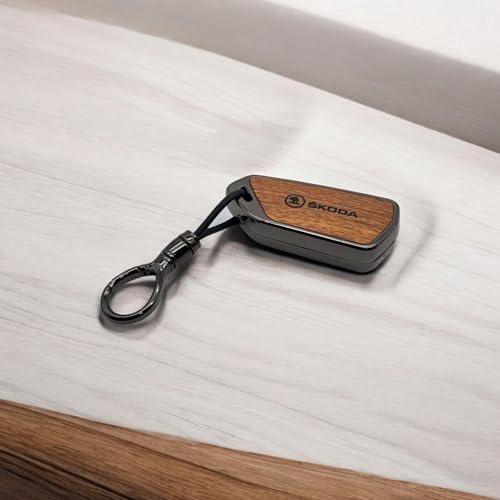 USHOP - جراب مفتاح سيارة ذكي معدني للسيارة، من يوشوب، غطاء حماية كامل لمفتاح السيارة الذكي مع ميدالية ،براون وود (SKODAA)