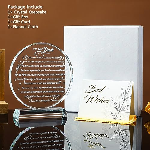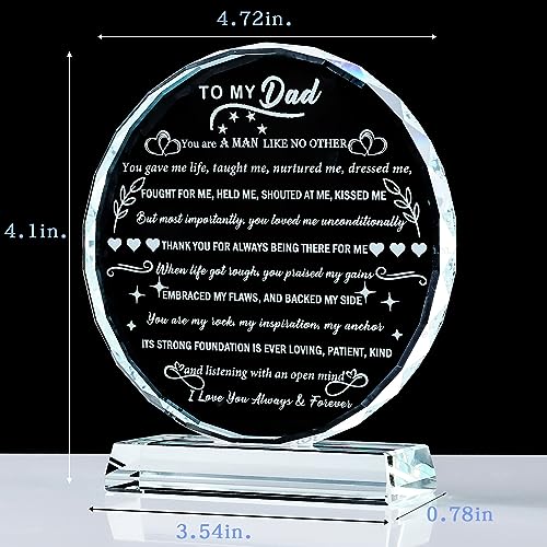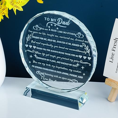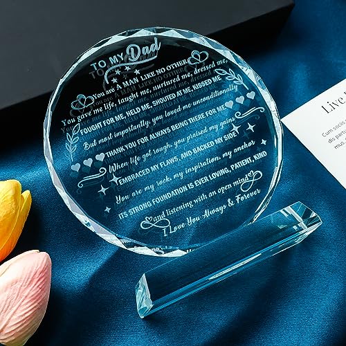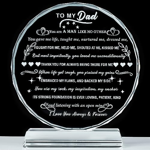 - هدية عالية الجودة للأب: هدية الأب هي تذكارات دائرية الشكل، مقطوعة من الكريستال الزجاجي عالي الجودة، باستخدام تقنية النقش بالليزر لنقش اقتباسات ذات مغزى، وأنماط رائعة في الجزء الداخلي الكريستالي، والتي لن تتلف سطح الكريستال. لن يبهت أبدًا، وستظل الكريستال دائمًا شفافة ولامعة، وستجلب هدية مدى الحياة للأب لمسة مدى الحياة