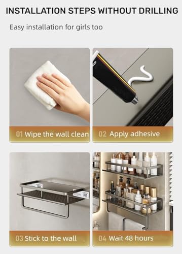 - 【طريقتان للتركيب] التركيب بدون ثقب، امسح الحائط أولاً لتنظيفه، ضع لاصق خالٍ من المسامير على قاعدة رف الحمام، ألصقه على الحائط وقم بتوصيل الملصق الإضافي، انتظر 48 ساعة للاستخدام العادي. تتضمن العبوة أيضًا ملحقات للتركيب المثقوب، وطريقتان للتركيب لاختيارك.