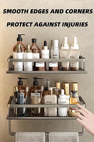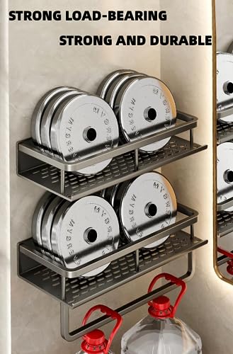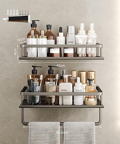 YWHWXB - منظم علبة دش من الفولاذ المقاوم للصدأ من YWHWXB، رف دش بدون ثقب، رف تخزين يثبت على الحائط للحمام وغرفة النوم وغرفة المعيشة والمطبخ (رمادي- 2 عبوة مع قضيب فوطة)