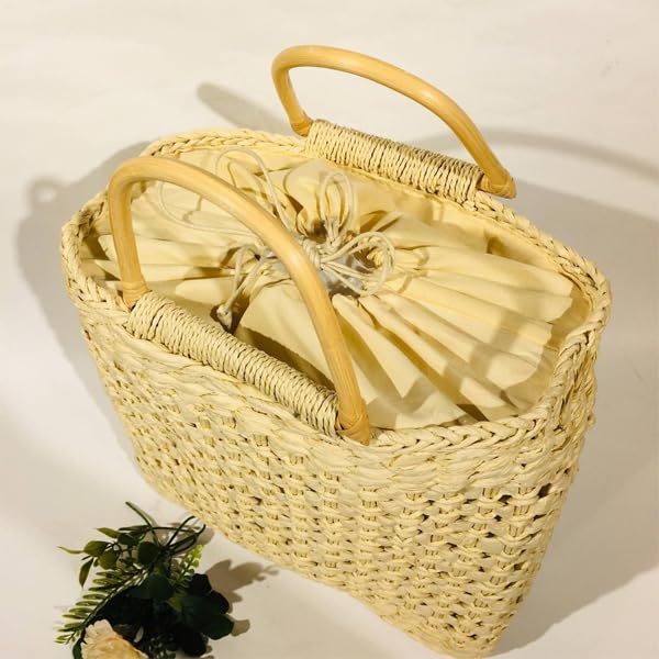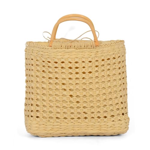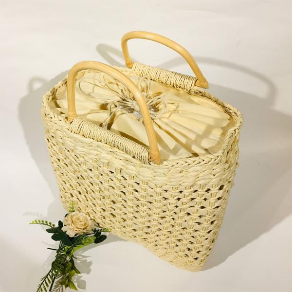شنطة كتف مصنوعة يدويا من القش للنساء - خوص طبيعي - للشاطئ - مقابض يد خشبية متينة - شاطئ صيفية - للعطلات بيج