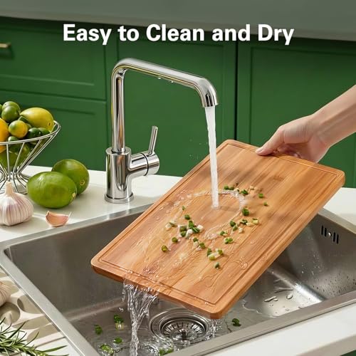 - أخاديد ومقابض لتقديم نظيف: يحتوي كل لوح تقطيع خشبي على أخدود عصير عميق لالتقاط الانسكابات ومقابض مدمجة لسهولة الرفع والتقديم. انقل الطعام من المطبخ إلى الطاولة دون عناء وبدون فوضى.