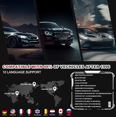 - أداة الماسح الضوئي التشخيصي OBD2 متوافقة مع 98% من المركبات واللغات المتعددة: تم تصميم ماسح OBD2 لقارئ الرموز للسيارات ليكون متوافقًا مع معظم المركبات المصنعة بعد عام 1996 في الولايات المتحدة الأمريكية و2002 في الاتحاد الأوروبي والسيارات الآسيوية 2008. إذا كانت سيارتك تحتوي على منفذ او بي دي 2 بـ16 سنًا وتم إنتاجها ضمن الجدول الزمني المحدد، فيجب أن تكون متوافقة مع قارئ الرموز ودعم أداة تشخيص الماسح الضوئي OBD2 لـ 10 لغات: الإنجليزية والفرنسية والإسبانية والألمانية والصينية والروسية والإيطالية واليابانية والبرتغالية والهولندية، مما يجعل من السهل استخدامها للأشخاص من مختلف البلدان.