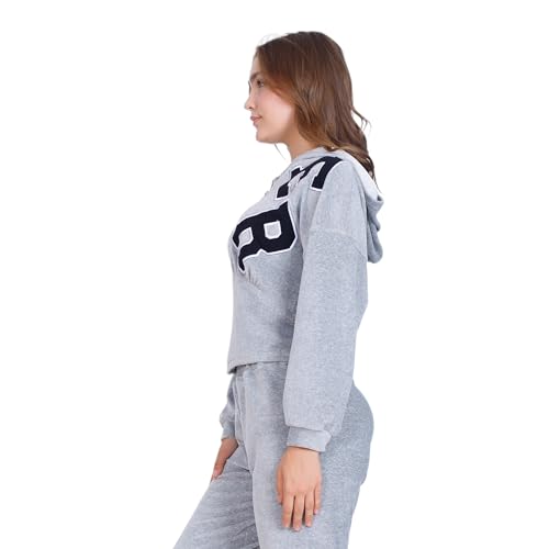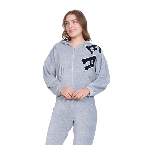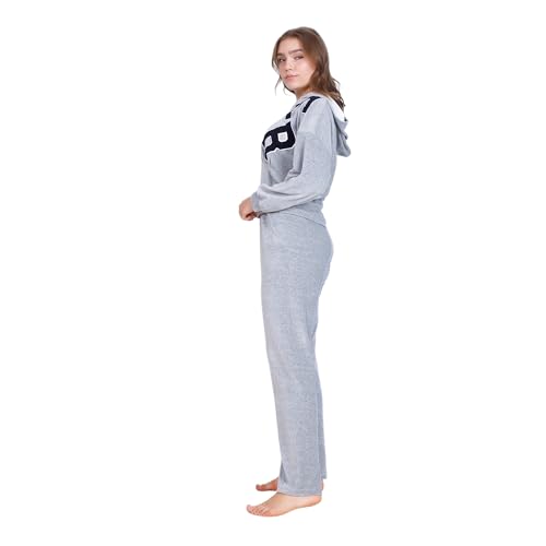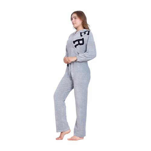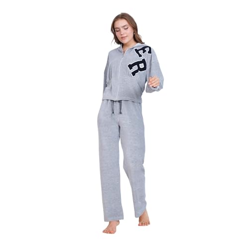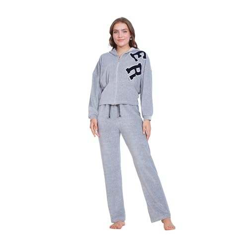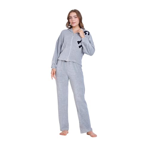 ZECOTEX - بيجامة شتوية من القطن القطيفة للنساء، جاكيت بسوستة + غطاء رأس بتطريز أمامي، طقم بيجامة قطن قطيفة، ملابس منزلية مريحة من زيكوتكس، رمادي