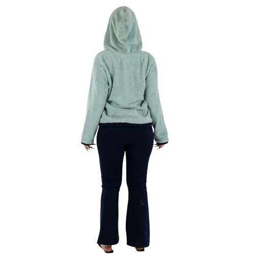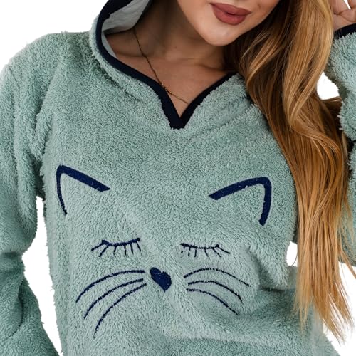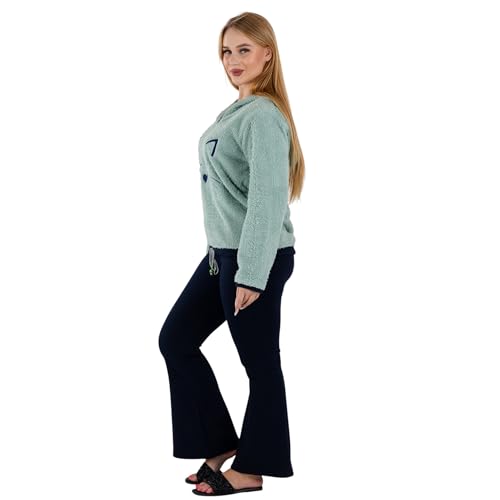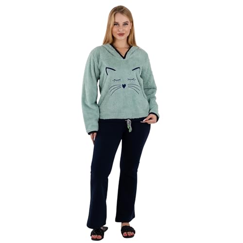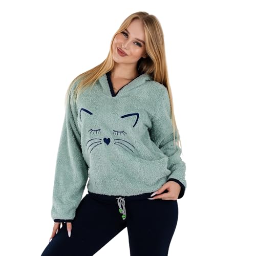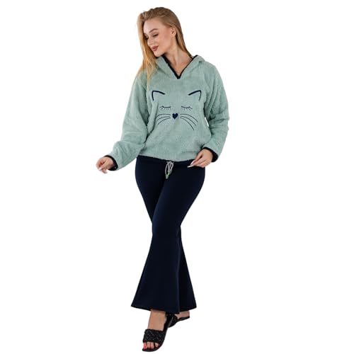 ZECOTEX - زدكوتكس طقم بيجامة شتوية من الفرو للنساء مع بلوزة بغطاء رأس مطرزة وبنطلون ميلتون | بيجامة حريمي فرو شتوي بتطريز وكابتشو + بنطلون ميلتون