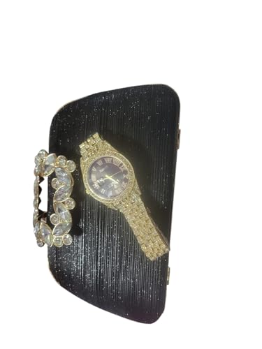 Generic - زدينو ساعة نسائية مرصعة بالكريستال مع أسورة، ذهبي، سوار معدني، وجه دائري أسود بأرقام رومانية، بطارية كوارتز، مع علبة عرض مع حقيبة سهرة سوداء مرصعة