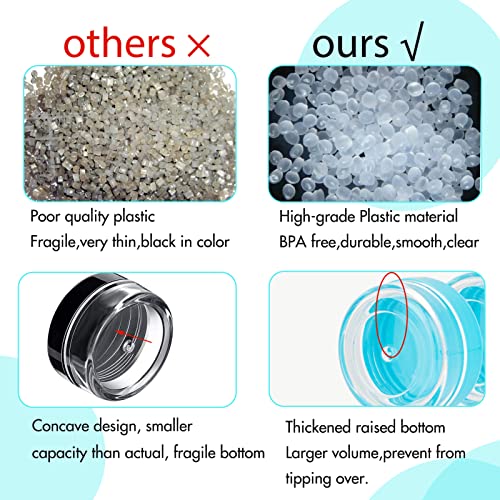- [تصميم عالي الجودة] برطمانات مستحضرات التجميل الصغيرة هذه مصنوعة من البولي بروبلين عالي الجودة، ولا تتفاعل كيميائيًا بشكل عام مع المكياج، وهي مقاومة للكسر والاعوجاج بفعل الحرارة، وتتمتع بإغلاق محكم، وتمنع التسرب. ومع هيكل زجاجة البوليسترين وغطاء البولي بروبيلين، فإن برطمانات العينات هذه شفافة وسميكة وناعمة.