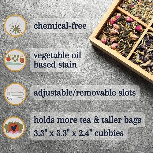 - صندوق تخزين متعدد الاستخدامات وقابل للتعديل - يمكنك تخزين أغراض أخرى في صندوق الشاي، مثل التوابل أو المنكهات أو أي قطع صغيرة متنوعة. يمكن تحريك الفواصل الخشبية وتعديلها لتناسب أي قطعة. نحن شركة عائلية صغيرة تديرها امرأة، ونخصص 1% من أرباحنا لصالح الجمعيات الخيرية في الولايات المتحدة الأمريكية.
