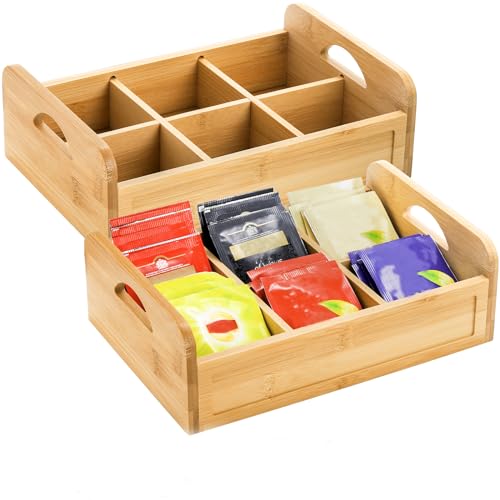 ZENFUN - زينفن صندوق منظم اكياس شاي من الخيزران حاوية تخزين 6 اقسام مع مقبض حامل كيس السكر المقسم توابل القهوة مربع رائع للقهوة والوجبات الخفيفة والاشياء الصغيرة بامبو بني