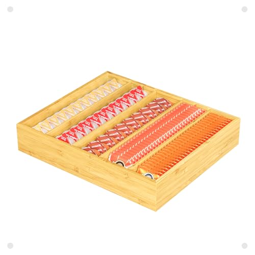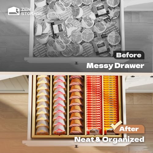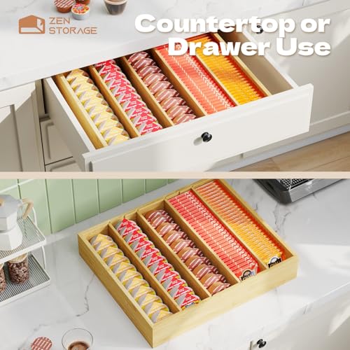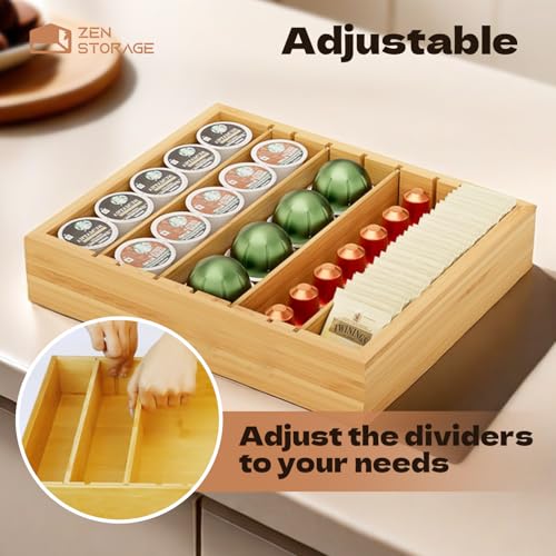 ZenStorage - حامل اكواب كيه بادراج من الخيزران من زين ستوريج، منظم اكياس الشاي مع فواصل قابلة للتعديل، حامل كبسولات القهوة لسطح الطاولة ومحطة القهوة والمنزل والمكتب والمطبخ STOA08B12NABamboo_01