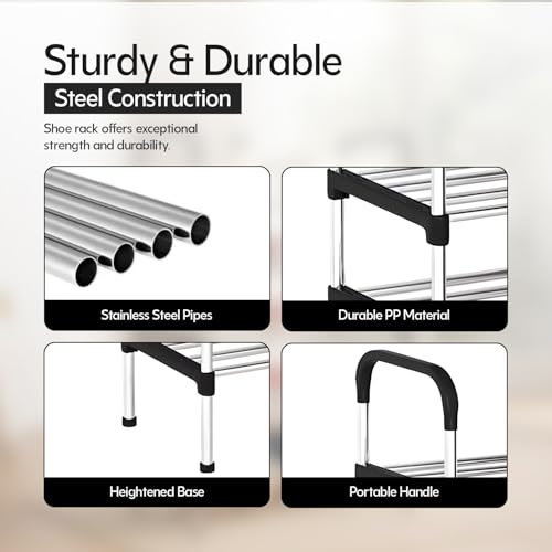 - هيكل ستيل قوي ومتين - مصنوع من 4 طبقات فولاذية جريئة، يوفر رف الأحذية هذا قوة ومتانة استثنائية. توفر الأنابيب الفولاذية عالية الصلابة ثباتًا طويل الأمد، وتدعم وزن الأحذية المتعددة دون انحناء، مما يجعلها آمنة وموثوقة للاستخدام اليومي.