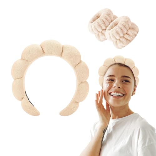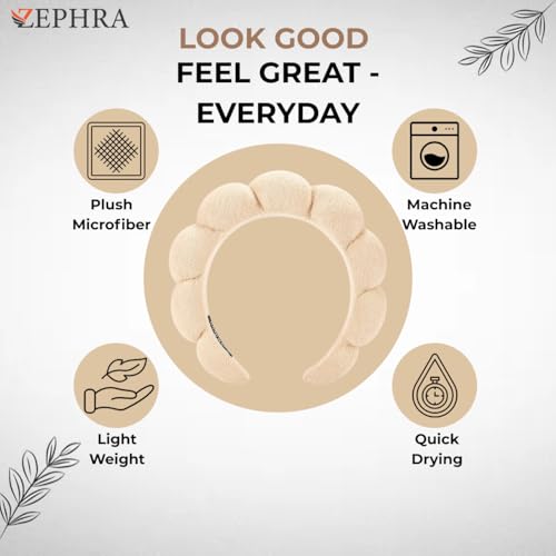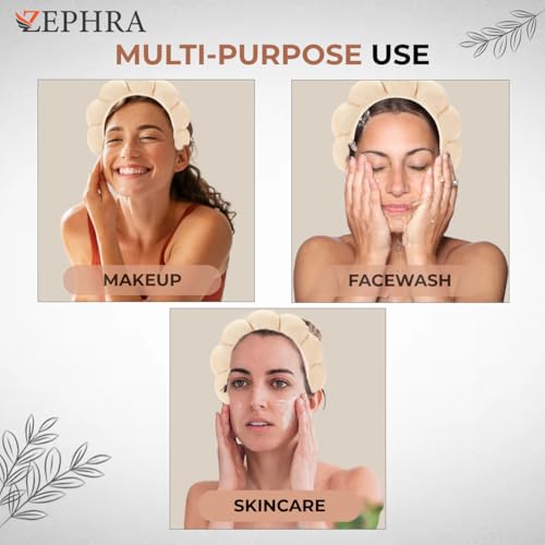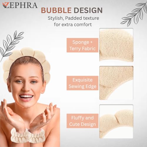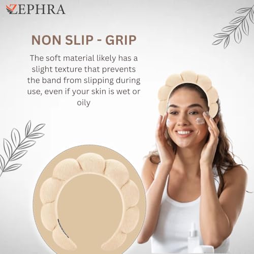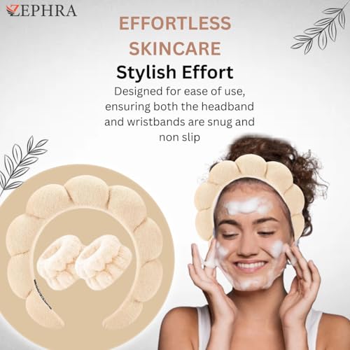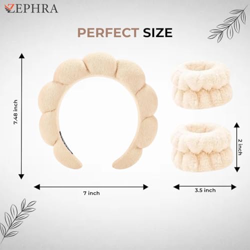ZEPHRA - مجموعة شريط راس واساور معصم من زيفرا - شريط راس مكياج من قماش تيري ناعم مع 2 سوار معصم لغسل الوجه، شريط شعر منفوخ غير قابل للانزلاق للنساء، شريط شعر ماص للعناية بالبشرة والجمال (بني)