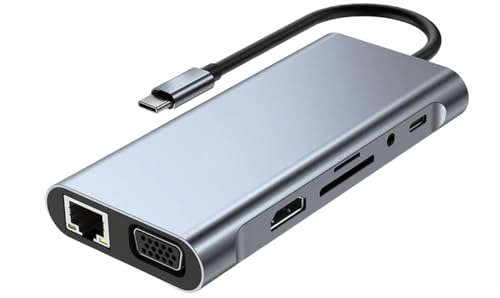Generic - محول 10 في 1 نوع C الى 4K HDTV مع شبكة محلية LAN وVGA وصوت وUSB 3.0 × 3 وفتحات SD وTF من زيرو - رمادي