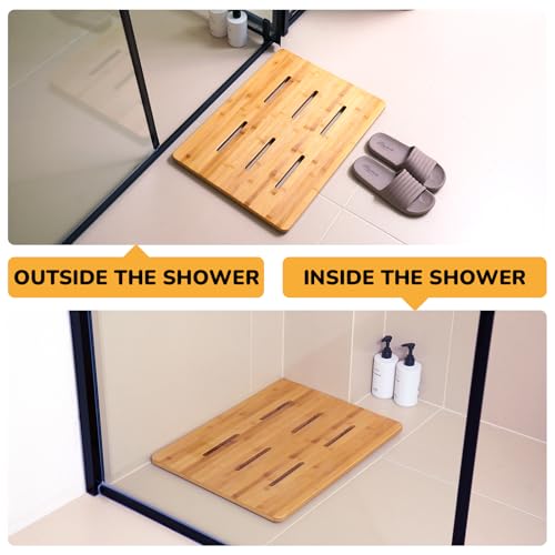 - 【تصميم سريع الجفاف】سجادة دش مقاومة للماء مع تصميم فتحة تصريف، فتحات تصريف مدمجة يمكنها تسريع تدفق المياه ومنع الماء من التجمع، في حين أن مادة الخيزران الطبيعية أكثر ملاءمة للحمامات الرطبة.