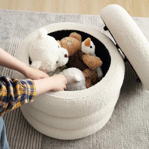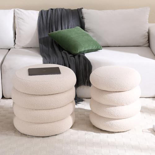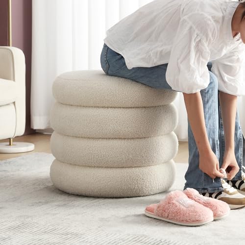 Zibeths - مسند قدم دائري صغير بوكل مع مساحة تخزين وغطاء قابل للإزالة، كرسي فانيتي منجد من الشيربا للمدخل وغرفة النوم من زيبيثس - لون اوف وايت