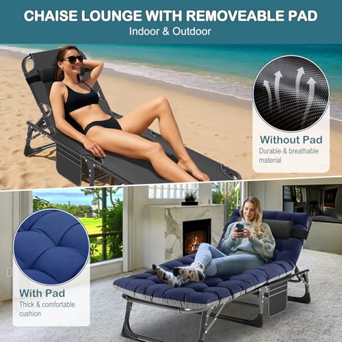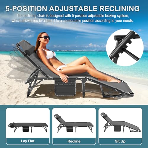 - 【ثبات معزز】تتميز كراسي التشمس بإطار مع خمسة أذرع قابلة للتعديل لمزيد من السلامة، ولها نظام دعم مثلث يمنع ارتداد الساق ووسائد القدم العريضة تقلل من ارتفاع الانقلاب.