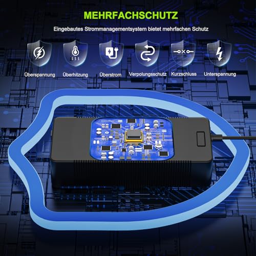 - حماية متعددة: الغلاف مصنوع من مادة ABS المقاومة للاشتعال. يوفر نظام إدارة الدائرة الذكي الحماية ضد الشحن الزائد والجهد الزائد وارتفاع درجة الحرارة والدوائر القصيرة، مما يضمن سلامة البطارية والشاحن.