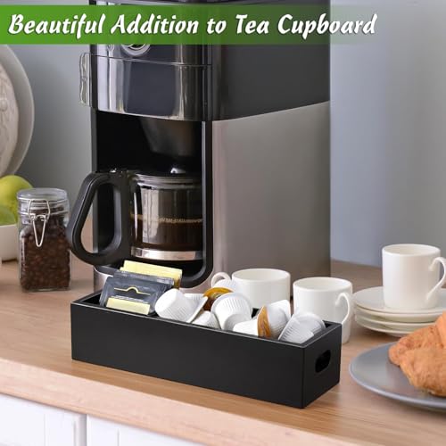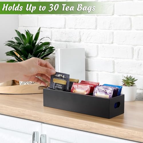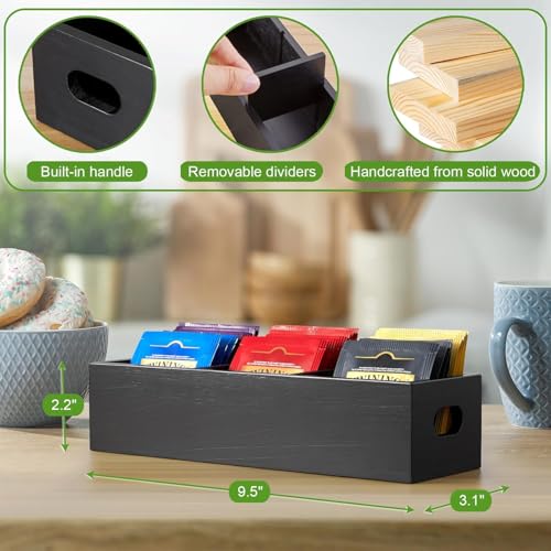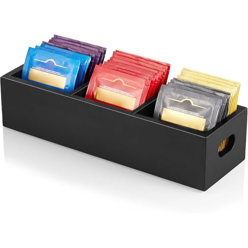 Zisoue - منظم اكياس الشاي الخشبي الاسود من زيسو مع 3 مساحات تخزين قابلة للتعديل - علبة تخزين متعددة الاغراض لاكياس الشاي وكبسولات القهوة وعبوات السكر ومستلزمات المطبخ الصغيرة