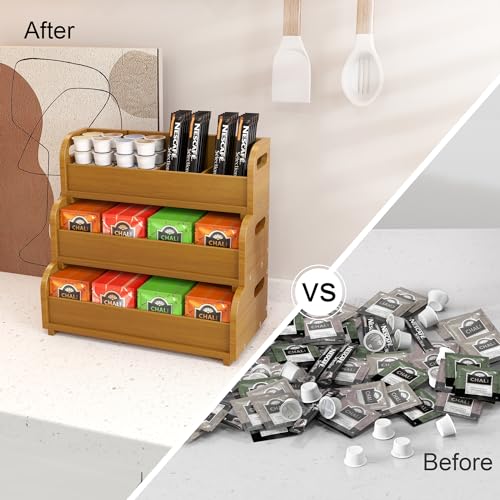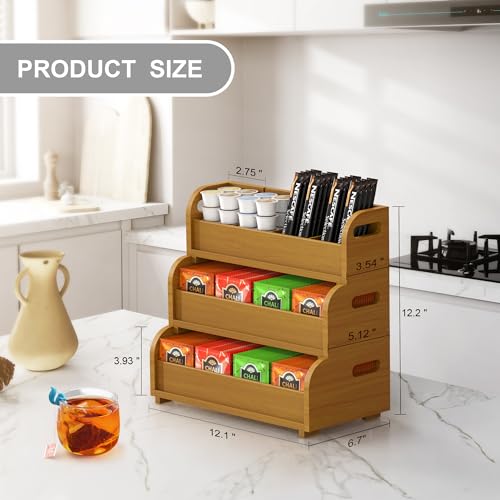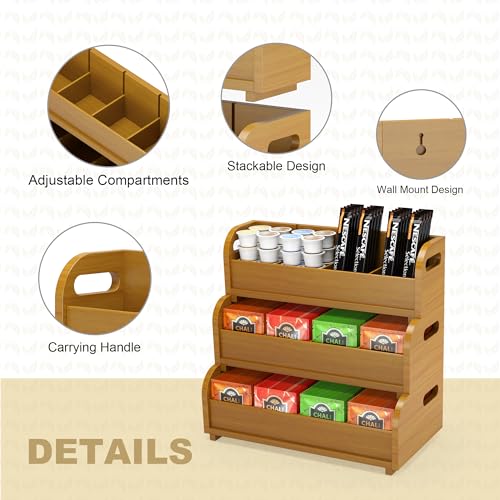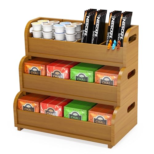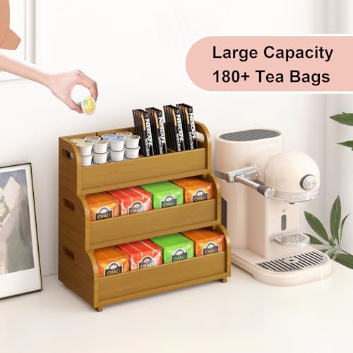 Zixpal - صندوق تخزين منظم لأكياس الشاي - رف عرض أكياس من البامبو مكون 3 طبقات قابل للتكديس على الحائط بسعة كبيرة للمطبخ والمكتب ومحطة القهوة خشب الجوز