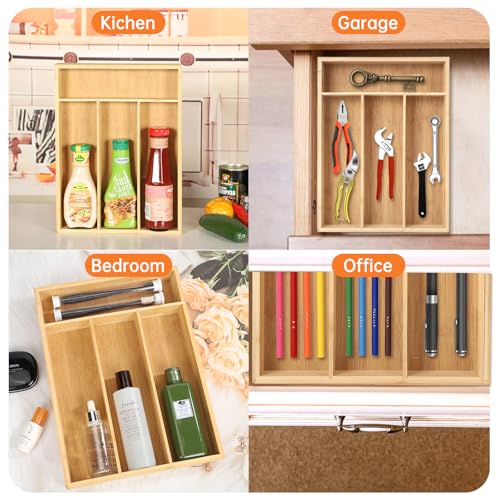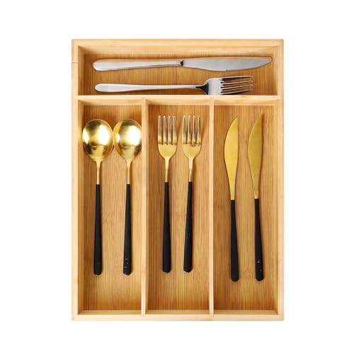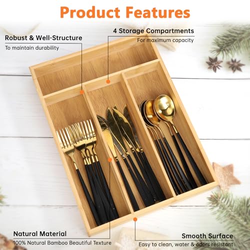 ZJYOUZHU - منظم أدوات المائدة الفضية من البامبو، منظم أدراج لأدوات المطبخ وأدوات تناول الطعام الخشبي، حامل لأدوات المائدة، قالب أدراج لأدوات المائدة مع فواصل مخددة من ZJYOUZHU، طبيعي، 4 فتحات