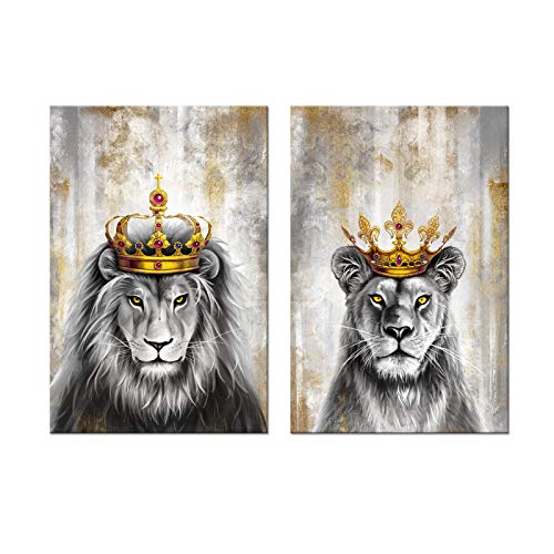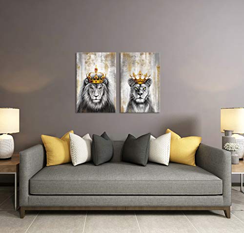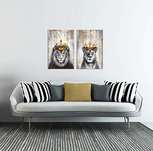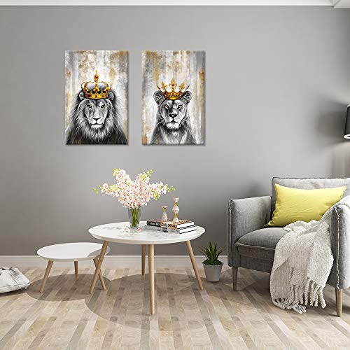 Zlove - تابلوه حائط من قطعتين مطبوع بصورة اسد وزوجته يرتديان تاج ذهبي، صورة رومانسية للزوجين باللون الرمادي، ديكور لغرفة النوم بتصميم مودرن، ببرواز وجاهز للتعليق، 16×24 بوصة، عدد 2 قطعة
