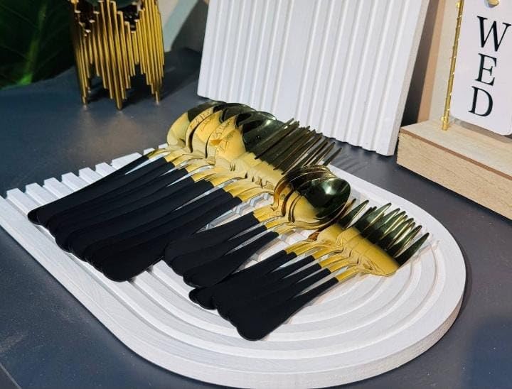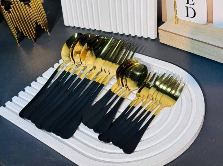 ZAL ZAIDAN - طقم أدوات مائدة ذهبية سوداء من زد ال زيدان,مكون من 24قطعة,طقم أواني مائدة من الفولاذ المقاوم للصدأ الآمن غذائياً بلمسة نهائية عاكسة للمنزل والمطعم.