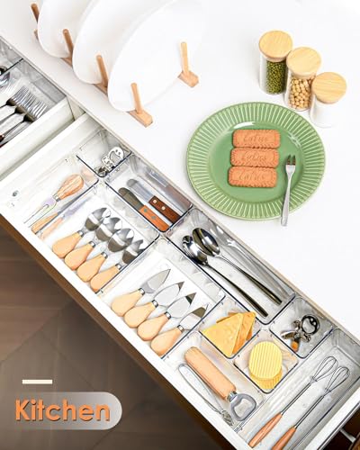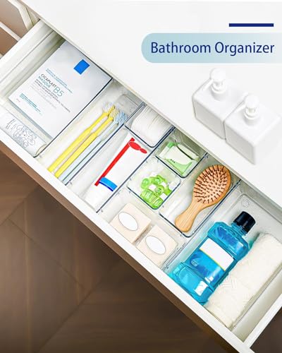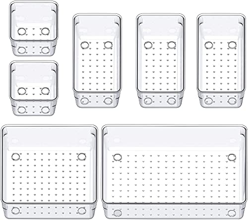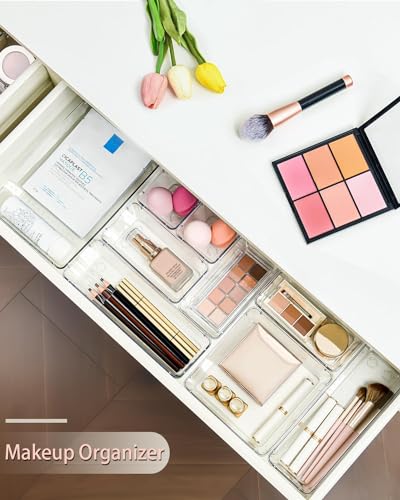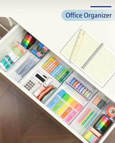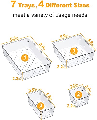 ZODZE - صناديق تنظيم ادراج المكتب من زودز، 7 قطع، منظمات ادراج شفافة، منظمات مستحضرات التجميل والتخزين، منظم ادراج بلاستيكي للمكياج والحمام والمطبخ والمكتب (مجموعة من 7 قطع مختلطة)