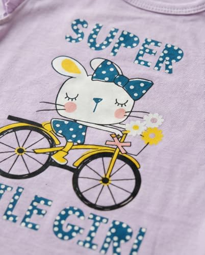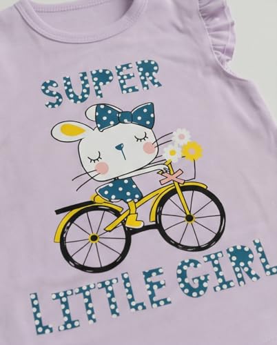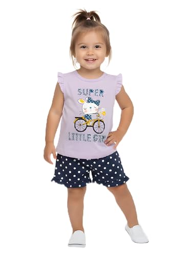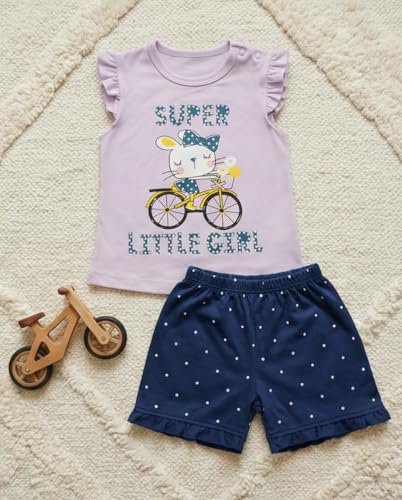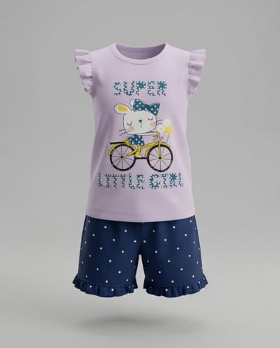 Zona Kids - طقم ملابس صيفية للبنات الصغيرات، تي شيرت مكشكش بدون أكمام مع طباعة كرتونية لطيفة، شورت منقط من القطن الناعم، طقم ملابس من قطعتين من زونا كيدز