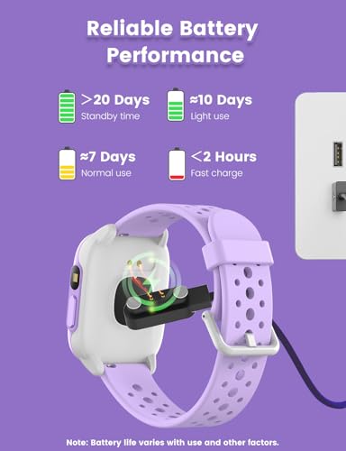 - 【عمر بطارية أطول】: يمكن للأطفال شحن ساعة اللياقة البدنية بسهولة باستخدام كابل الشحن المغناطيسي، ويمكن أن يصل وقت العمل إلى 5-7 أيام (يختلف وفقًا للاستخدام وعوامل أخرى). وهذا يعني أنه يمكن للأطفال استخدامها دون القلق بشأن شحن الساعة باستمرار