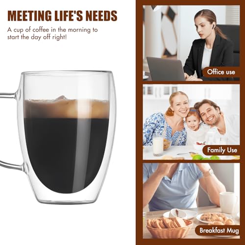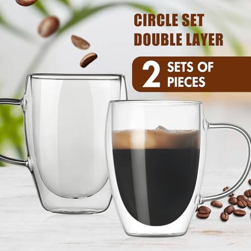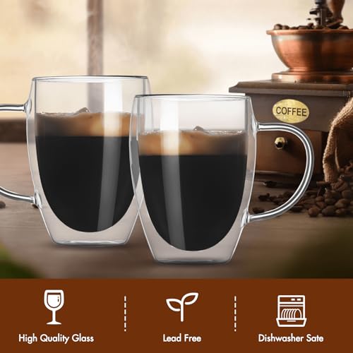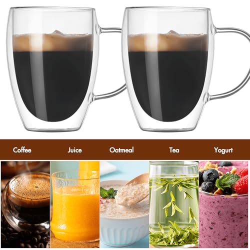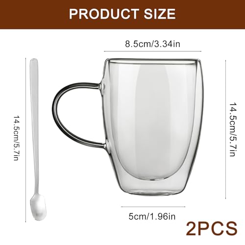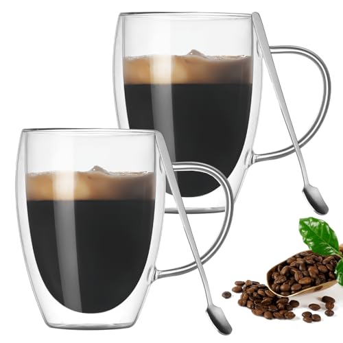 ZONJIE - زونجي اكواب قهوة زجاجية مزدوجة الجدران مع ملعقتين، اكواب شاي كابتشينو لاتيه 450 مل مع مقبض، اكواب شرب مقاومة للحرارة للقهوة والشاي والحليب والعصير والايس كريم (450 مل)