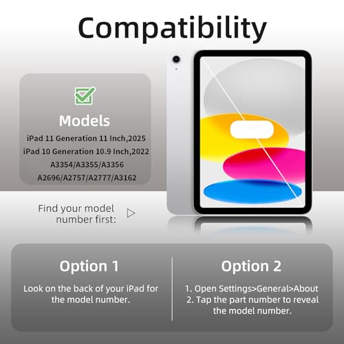 - [الموديلات المتوافقة] حافظة ايباد الجيل العاشر 2022 10.9 انش (رقم الموديل: A2696、A2757、A2777) غير متوافقة مع أي موديلات ايباد أخرى. يرجى التحقق من الجزء السفلي الخلفي لجهاز آيباد الخاص بك للعثور على رقم الموديل