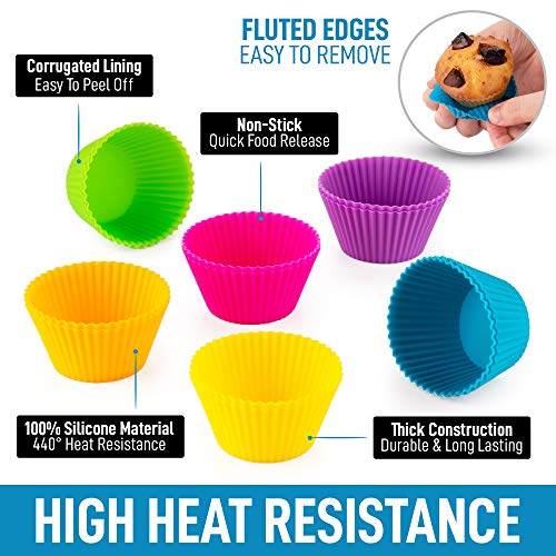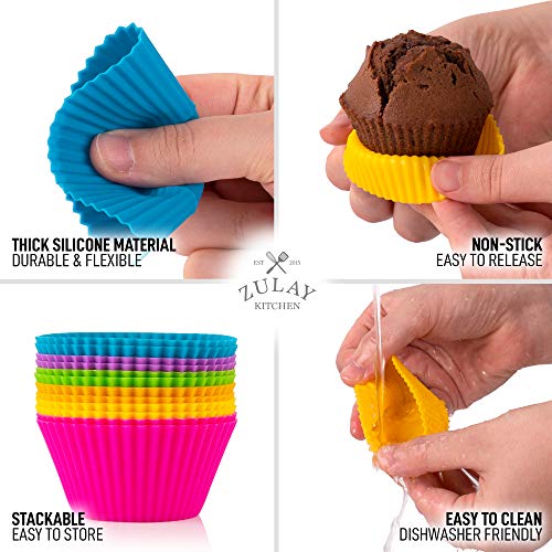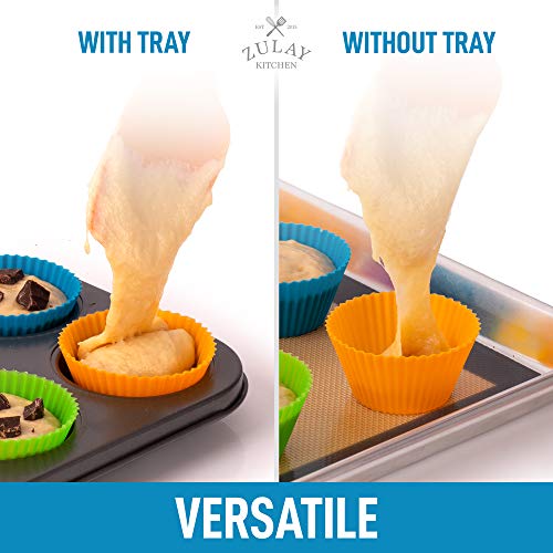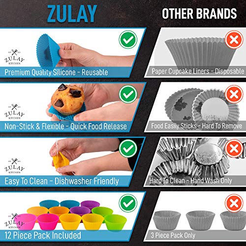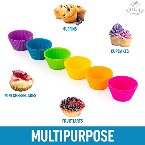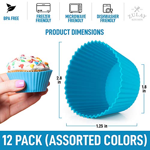 Zulay Kitchen - بطانات كب كيك مصنوعة من السيليكون من زولاي، بطانات واكواب خبز كيك سيليكون قابلة لاعادة الاستخدام، بطانات خبز من السيليكون بحجم قياسي للكب كيك والمافن وغيرها، 12 قطعة، متعدد الألوان