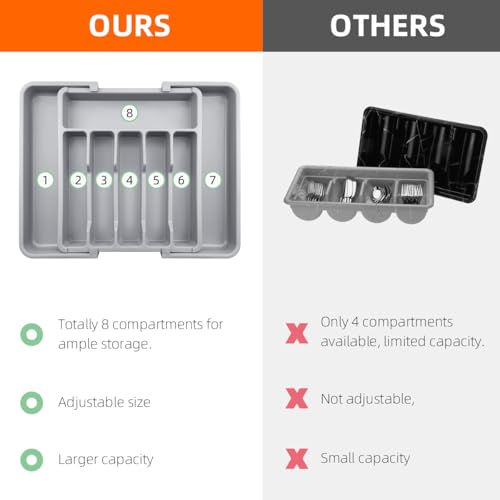- 【ابق أنيقًا】منظم أدراج أدوات المائدة الفضية المكون من 8 أقسام يسمح لك بتصنيف وتخزين أدواتك بشكل أنيق، مما يحسن مساحة الدرج. مع كل شيء يسهل الوصول إليه وترتيبه، يمكنك تحديد مكان العناصر التي تحتاجها والتقاطها دون الحاجة إلى البحث عنها.
